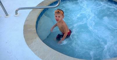 hot tub with lush, mature landscaping.